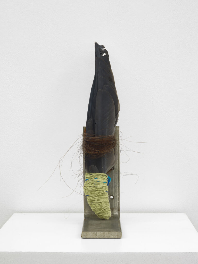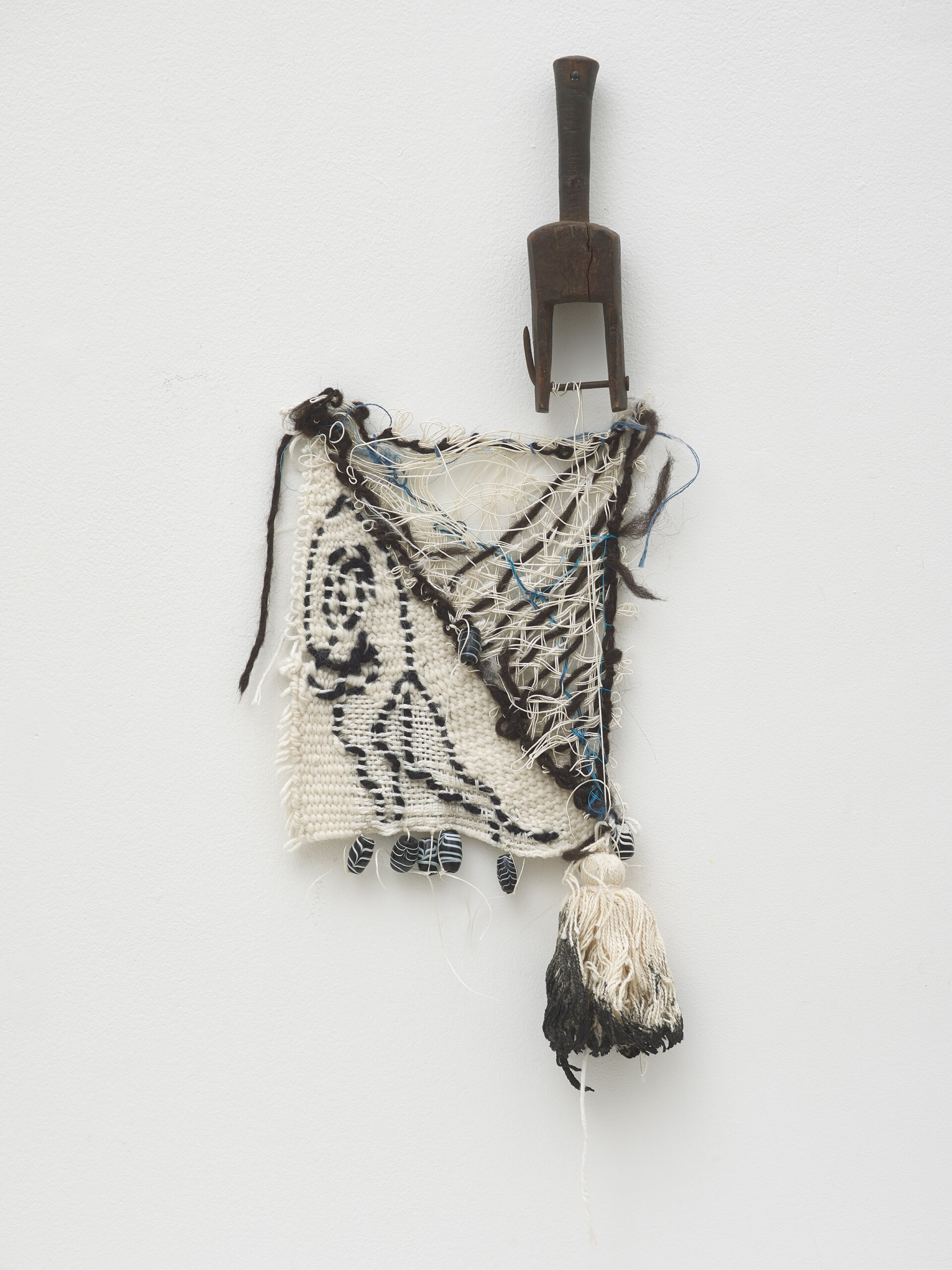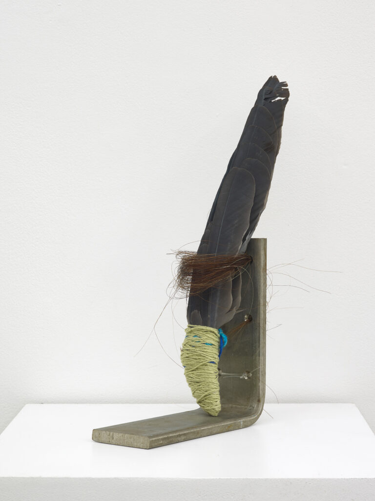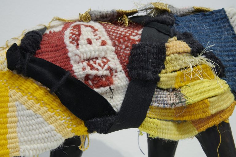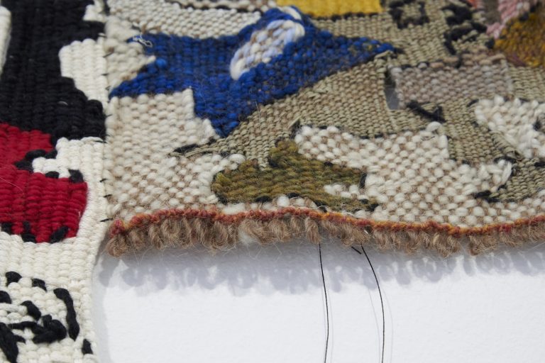Hill-Montgomery’s weaves, begun in 2013 and made on homemade looms, combine both techniques and materials. These intricately layered works, made from materials including Navajo sheep wool, linen, silk, kid mohair, punis, rawhide and horsehair, allude to the artist’s own personal narrative as well as broader socio-political and feminist concerns, popular culture, desire and devotion. Amy Tobin writes: ‘Hill Montgomery’s textile practice bridges traditional craft with canvas and tapestry pictorialism. Her weaves behave like history paintings of landscapes, while their extreme facture – a result of the loose knot of a hand loom weave – emphasises her rich combination of materials… These materials create texture and form, offering three dimensionality; but they also enhance and complicate meaning.’