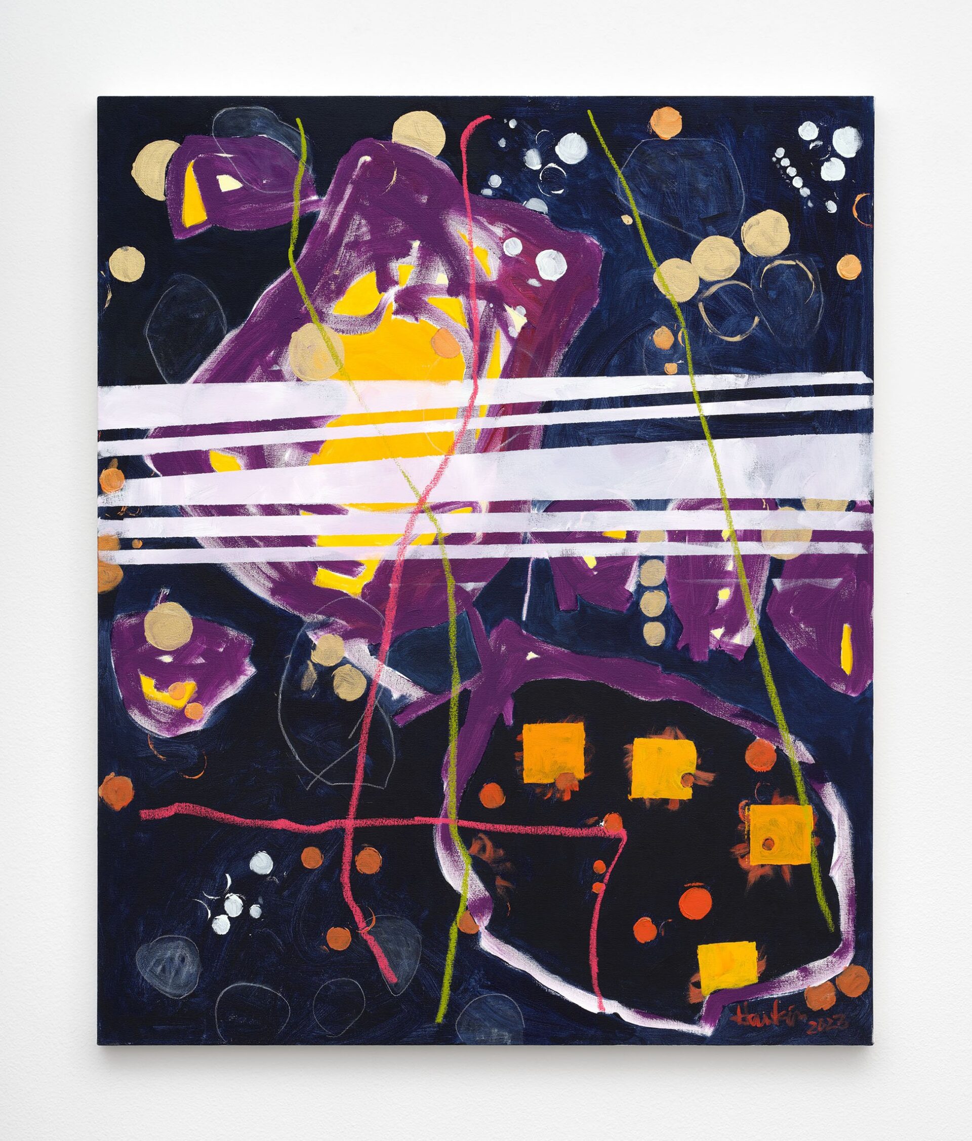 While her work in the late 1990s shifted towards the abstraction of references sourced from the physical world – from the forest floor to microbiological contours and astronomic forms – Hawkins maintains that her ‘practice is abstraction’. Hawkins subverts expectations of figuration as a de-facto-political mode, offering the non-objectivity of her chromatic worlds as a way into painting’s social possibilities. The intertextual relationships between symbols, signs, geometric contours, and calligraphic marks merge into an ecosystem of forms that develop the painterly beyond mere expressionism.