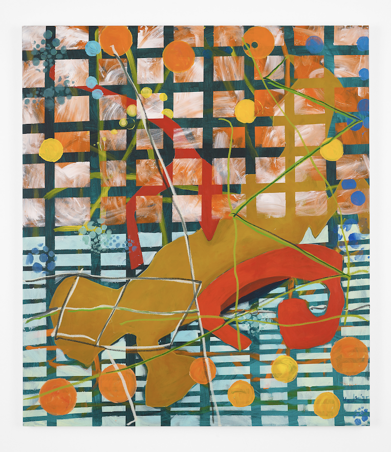 It’s as if here, at this last moment before leaving the series, Hawkins has wanted us to connect the ways she’s invented to hold her worlds together with those older painting traditions where the ligament is given by perspectival technologies. The suggestion might be that the figurative is not enemy to the abstract, in Hawkins’ ways of reckoning it. That this distinction is not entailed in her tradition of abstraction. Her abstraction is a cosmology. A mesh that is never certain of its coordinates, only its tendencies and its traditions for unlearning and mending. In Hawkins’ ligamental abstraction, there are no enemies, only obstacles, assays, re-assessments, and moving on.’