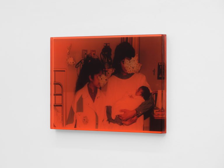 Kang Seung Lee, Untitled (Harvey), 2020–22, graphite on paper, antique 24k gold thread on Sambe, archival pigment prints, walnut wood, walnut frame, overall: 118 x 158 x 12 cm