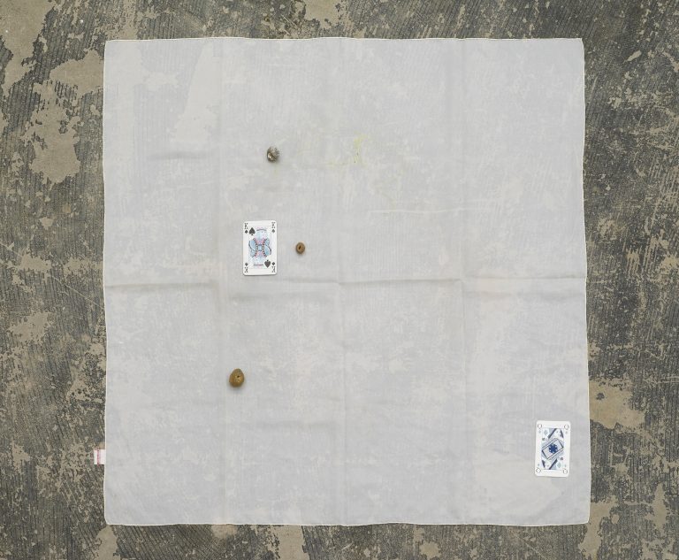 Putting it on, 2015, jacket, embroidery, hangers and hooks, dimensions variable